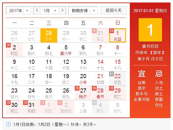 一、 元旦放假時(shí)間為2016年12月31日至2017年1月2日放假調(diào)休,共3天。1月1日放假,1月2日(星期一)補(bǔ)休。